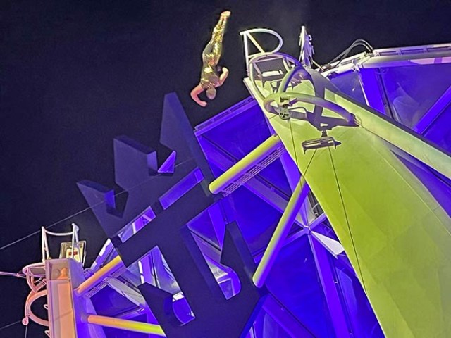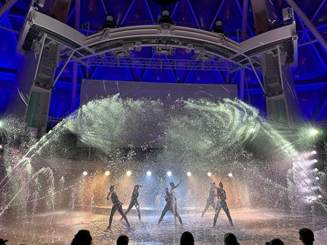 There are theater shows like you find on most cruise ships, but Wonder also has an AquaTheater with a high-flying high diving fast paced in and out of the water show and a skating rink with an ice show.