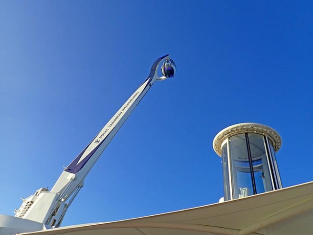 One of Quantum’s most unique features is the North Star, a mostly glass pod that rises 300 feet above the ship for the best 360-degree views at sea. In its lowest position a small group of people can enter, having reached the pod’s entry level on either a stairway or elevator from the deck below. As it rises it extends over one side of the ship and hangs over the other side on the way down so you not only get views from straight up above the deck, but also from each side as well.