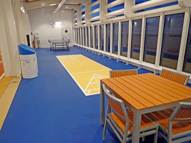 Each side has a wide area of open space to the water side of the track where there isn’t a lifeboat. These spaces have places to sit and things to do. One has shuffleboard and a ping-pong table, the other more chairs and tables. Lifeboats surrounding the track means there are no rooms with their views blocked by lifeboats on this ship.