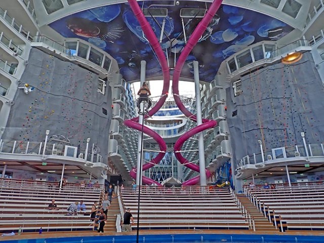 The outside promenade deck is actually set up as a running track. Although it is on the outside of the ship it’s mostly sheltered. The bow area is under cover and both sides are mostly protected by lifeboats, with a few view spots in between. The back is wide open for a great view of the wake and where the ship has been. On the inside edge of the track at the back there are windows into the AquaTheater and a view of the rock climbing walls and Ultimate Abyss 10-deck slides.