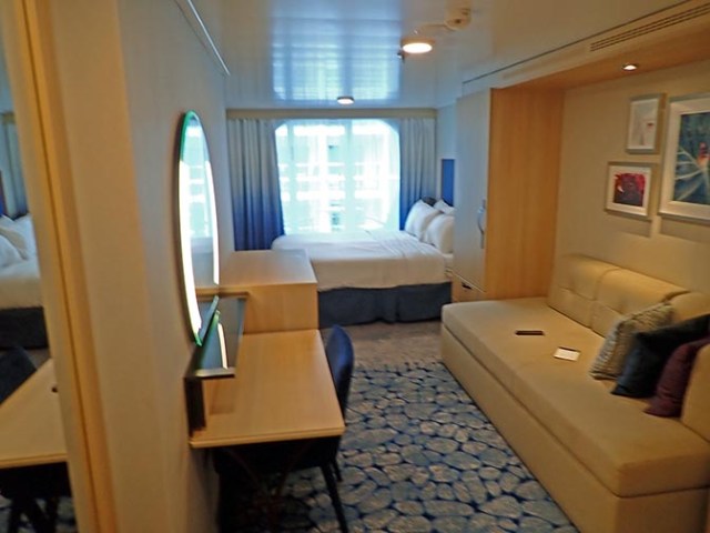Most ships have inside cabins and outside cabins, but this one has inside cabins with a view. Most also have balconies, though there are some with windows instead. These cabins mainly overlook either Central Park or the Boardwalk, which are interior areas that are open to the sky. There are also a few cabins with windows overlooking the Royal Promenade, an interior area of shops and eateries resembling a city street. We had a balcony cabin in Central Park, which has gardens with real live plants. We actually used this balcony more than we ever have oceanside ones as it was more sheltered. It almost always had at least some shade, and never got wet beyond the railing even when it rained.