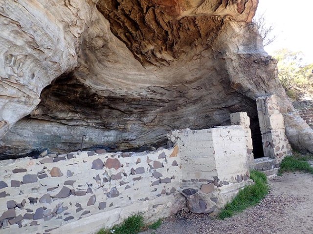 A short trail near the large flat rock where people pose leads the remains of an old building under an overhang. There’s a small cave nearby up in the side of the rock that people sometimes climb up to.