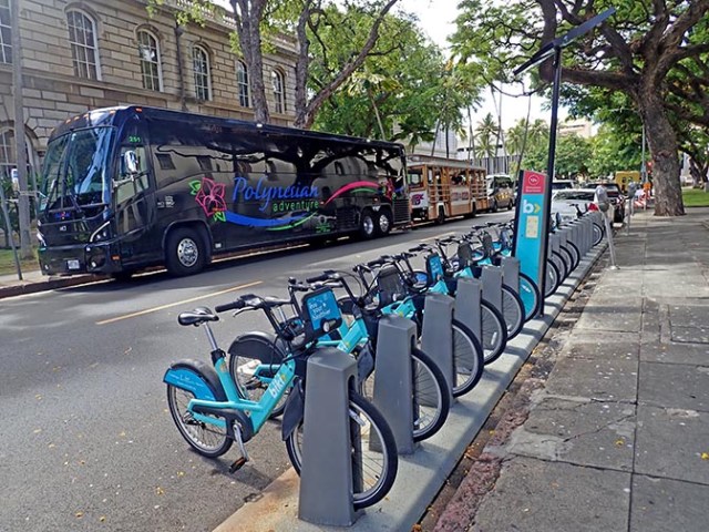 The Waikiki trolley doesn’t go to the port, but we saw it in a couple places not far from there so it’s also a possibility for transportation to more distant places if people don’t mind walking a bit to find it. We also saw a bunch of bikes for rent alongside of a road so people who like to get around by bike could have that option as well, again if they didn’t mind walking out of the port a bit to find them.