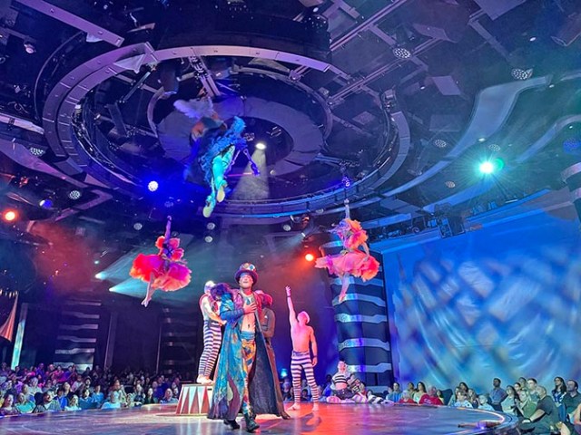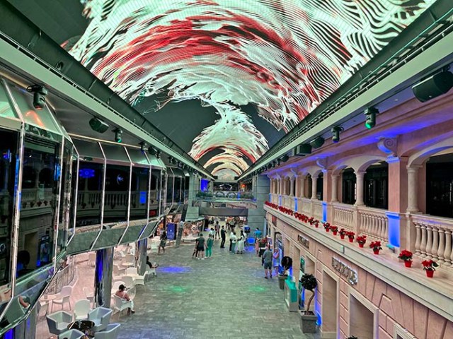 One of the highlights of the ship is the dome over the galleria, or promenade area. Patterns change throughout the day portraying anything from fancy ceilings to sunny skies. Several times throughout the day there’s a dome show on that ceiling. Some were patterns of light and color where others were a sequential show.