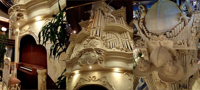 bottom, middle, and top of the atrium centerpiece which looks like a giant pipe organ that rises 3 decks high and takes up the entire center of the atrium