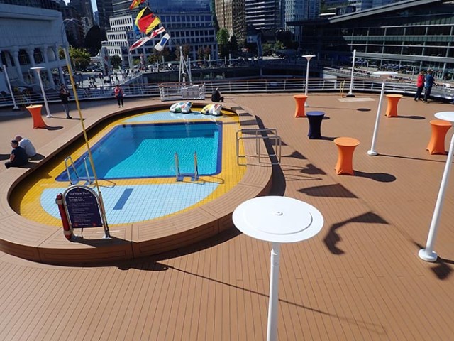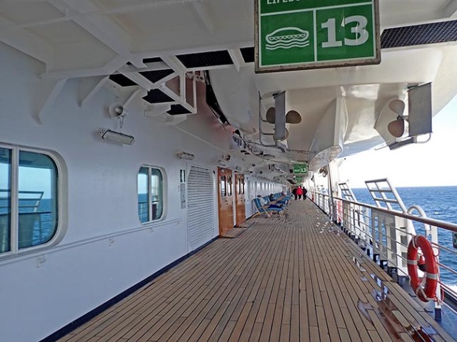 Zaandam has 10 passenger decks, 5 of which have cabins. There are no cabins specified as balcony cabins on this ship. Balconies come only with suites though the vista suites are similar to mini suites found on other ships which is basically a slightly larger balcony cabin. There are also no cabins behind the lifeboats, though there are some with obstructed views on the lower promenade deck where the window is behind the metal structure on the outside of the ship. All oceanview cabins on the promenade deck have windows looking onto the outside promenade where people can walk around the entire ship. Most of those cabins have views to the sea across the promenade, but not direct views like the ocean view cabins on the two decks below with a window directly above the sea. The outside promenade goes all the way around the ship, making a nice place to go for a walk when weather permits.