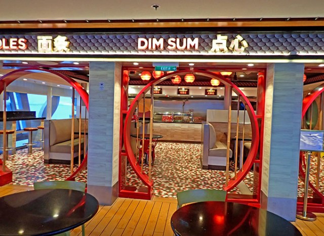 Most ships have a pool grill that’s open daily all afternoon, but this ship only had a part-time pop up one. Both that and the ice cream stand were behind garage style doors on the pool deck. Neither were marked or listed on the deck plans. When the doors were open they served their respective products, but when they were closed you would never even know the place existed. There was a noodle place on the pool deck, but the noodles cost extra. It did offer chicken nuggets or mini-hot dogs for free.