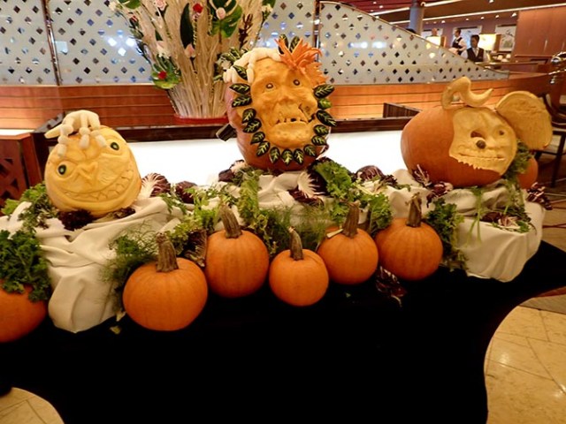 At dinner there were pumpkin carving displays in front of the dining rooms, a different one at each of the two levels. They did not have a special Halloween dessert like ships sometimes do.