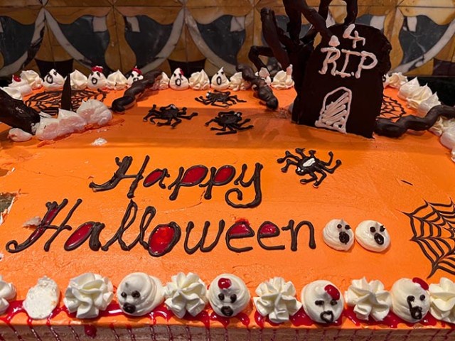 At lunchtime there were a couple fancy Halloween cakes in the dessert area at the buffet. People had already cut into them before I got there even though lunch had barely started so I only got photos of partial cakes. One was about half gone and the other just had a corner missing.