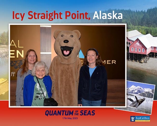 Usually there’s a photographer outside the ship at each port stop, but on this cruise the closest thing was someone in a bear suit outside of the buffet at Icy Strait Point. We didn’t go to the buffet at the other ports so I don’t know if they had anything there for them. We have been on ships in the past where the photographer wanted people to stop on the actual gangway getting off the ship, which really stuffs up the disembarkation line, but when they are off to the side near the ship or somewhere within the port then people who want a photo can get one while those who don’t can easily just walk on by so that’s the best way. The other Royal Caribbean cruises we’ve taken had photographers out at the ports so I’m not sure why this one didn’t.