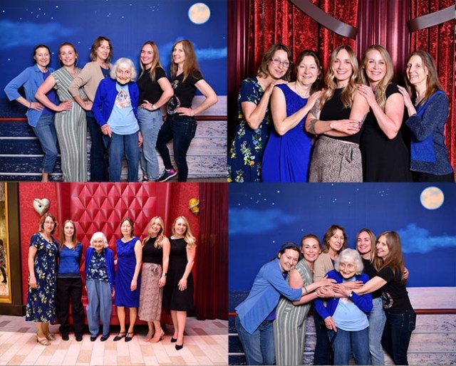 In the evenings on Quantum of the Seas there were always photo booths somewhere around the ship, even when it wasn’t formal night. Of course on formal nights there were more of them because more people want photos then. The photograpers all had the same standard poses they wanted to use each time. They generally took one with everyone standing there, some sort of hugging photo, one with hands on hips, and one where everyone was touching each other in some way. Usually they had people facing each other in a line, but sometimes they did facing away instead.