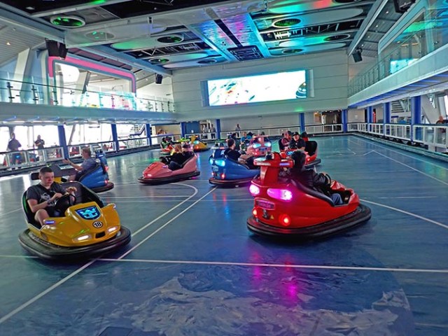 The SeaPlex is another unique feature of the Quantum Class ships. So much more than a standard sports court, this area can be transformed for quite a variety of activities varying from sports tournaments to lasar tag to bumper cars. When not in use, the bumper cars park along the edge of the area alongside the SeaPlex court, but when it is bumper car time they move into the sports court, which has more room to drive them around than often found in bumper cars at carnival rides. It’s lots of fun.
