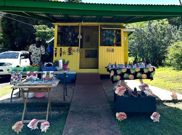 The port shopping area had a live local band playing for tips which was one of the first things we came to after leaving the secure area on the pier itself. One scrawny little tree had a nest and a loudly chirping little yellow bird who probably lived in it. There were some of the usual shops found at most every cruise ship port in addition to other shops as well as bars and eateries. In the middle of it all there was a little booth with photos of places an island tour goes and of various beaches you can get a ride to. Lots of people with island tour signs milled about that area waiting to find enough people to fill up their van for a tour.