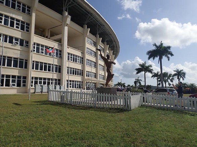 The first stop on the tour was a cricket stadium that also holds international soccer games. It was empty at the time other than a few people who worked there, though they will still charge admission if they see people go inside. Outside of the stadium were some palm trees with a different sort of palm fronds than what we used to always see. The guide said that all of the coconut palms that used to populate the island died of a disease and these new ones were some sort of ornamental palm planted to take their place. They also mentioned a major die-off of the coconut palms on Saint Kitts so apparently the palm plague spread to more than one island.