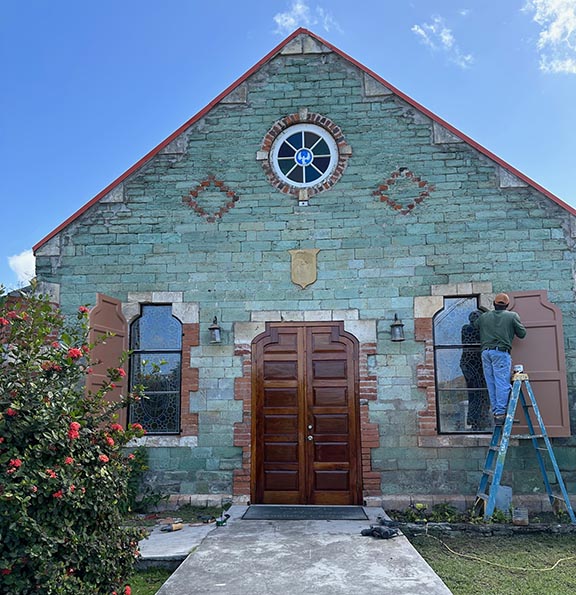We made a brief photo stop at a small old church called Saint Barnabas Anglican Church made from naturally green stones local to just that one area of the island. It wasn’t actually on the tour, but after everyone wishing we had stopped at one of the stone churches on St. Kitts this time I asked and everyone in the van got out to take photos. There were some people working on the building, but they didn’t seem to mind us taking pictures of it. Besides the unusual colored stone walls it also had some lovely stained-glass windows.