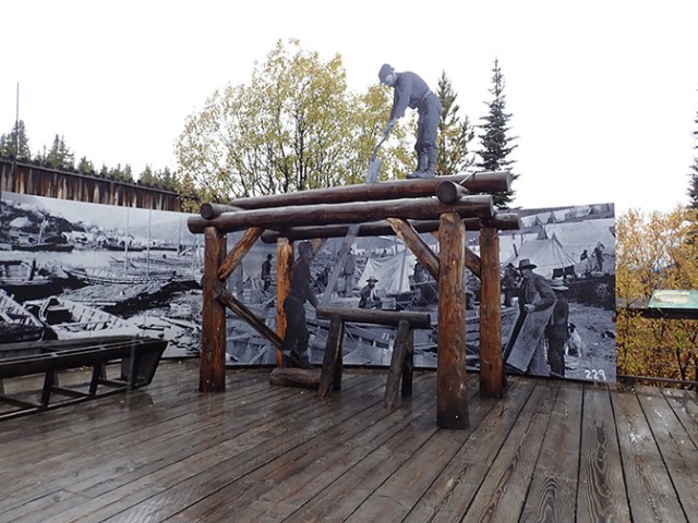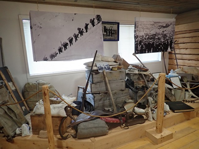 The Mountie Museum included a display of a ton of goods, which is what the gold rush people were required to have to enter Canada. The Mounties had an outpost near the boarder to watch over the gold rush stampeders and make sure they complied with that rule. The most-used routes into the Yukon for the Klondike Gold Rush of 1897-1898 were the White Pass trail from Skagway and the Chilkoot Trail from nearby Dyea, a town that no longer exists. The train was not built yet so they had to bring that 1000 pounds of goods up the mountain bit by bit on their backs or those of pack animals. So many horses died along the White Pass trail it has a place called Dead Horse Gulch where their bones still lie at the bottom. Horses weren’t the only ones to die. Would-be miners died of hyperthermia and avalanche. Once they got their year’s worth of goods to the border, which took an average of 3 months, they traveled by boats they made or bought for the remaining 500 miles to Dawson City. Those who could afford it had an all-water route to Dawson City, avoiding the months of mountain trekking with all their goods, but the majority didn’t have enough money to take that route. The gold rush was over by the time the White Pass Railway was completed.