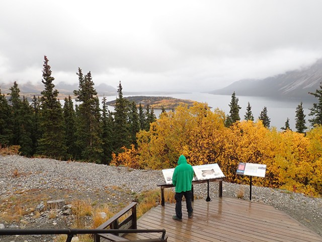 The next stop was a brief photo stop at a viewpoint overlooking a lake. A lot of trees were starting to turn color, sporting bright yellow fall foliage. Yellow was definitely the dominant color for fall leaves in that area of the Yukon.