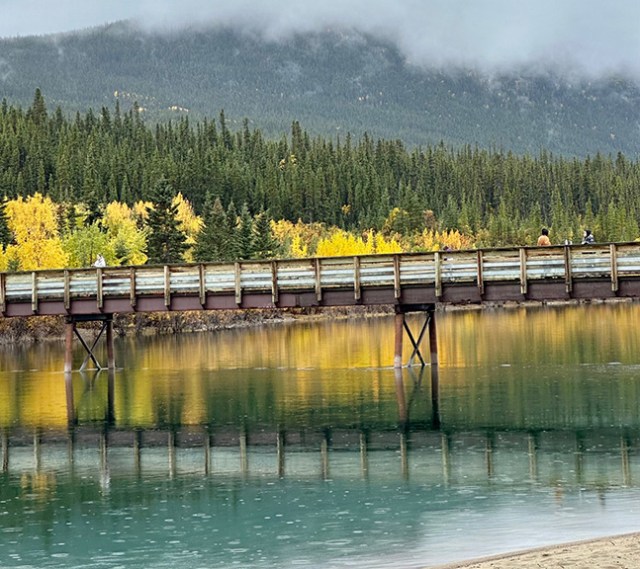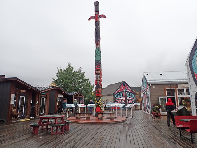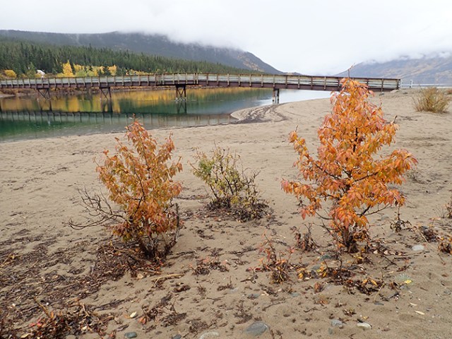Kitty-corner across the street from the old general store the town had a bridge from the White Pass Railway. Just down the river from that was a foot bridge, which a little trail slightly above a small sandy beach led to. Both bridges were quite photo-worthy. The train bridge reflected into the still water below, easily photo’d from the foot bridge. Trees in yellow fall color reflected into the water on the far shore, also begging to have their picture taken from the foot bridge. Nobody else from the bus wandered out that far so they really missed out. The bridges and surrounding scenery were the best thing in Carcross. It even stopped raining while we were there and the sun peeked out a bit so at that stop we could wander around and stay dry.