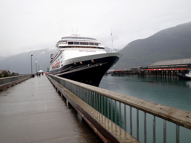 Having already done the White Pass Railroad a couple times we opted for something different on our port stop in Skagway from Holland America Zaandam. We docked next to Grand Princess, who was at the dock that had been blocked by a landslide last year when our cruise on Quantum of the Seas got diverted to Sitka since its berth in Skagway was inaccessible. That dock sits next to a steep hillside, which was bearing a vegetation-free scar where the landslide had been, though the dock was totally clear for this visit. The train for that dock goes all the way down the pier to the ship since it is a longer dock and farther from shore. Zaandam’s dock was closer to shore so the train parked in front of the ship on land rather than on the pier next to the ship. That pier didn’t even have tracks, but it’s a short walk up the pier. Busses for other excursions meet in the same area as the train. There was a little booth for booking last minute excursions with a list of a variety of things to do, and a couple covered sheds where people could stay dry while waiting for ship’s excursions to start.