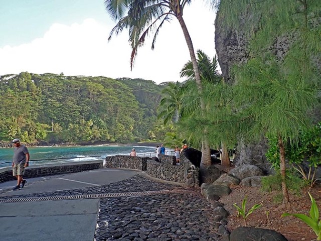 The last stop was Arahoho Blowhole. When we went there on our last visit to Tahiti, the blowhole was next to an old washed-out road that had been replaced by the tunnel the road now passes through. This time much work had been done there with a walking path and edge walls where the old road had been, and a gift shop at the entrance to a parking area that had some picnic tables.