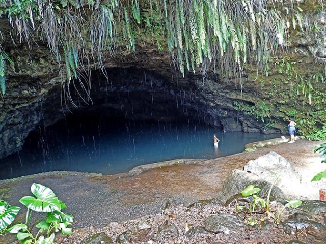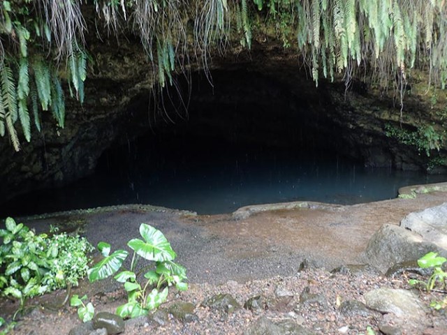 Our first stop was at Grotte De Maraa, a place the tour guides all refer to as the grotto. What appears to be a small water-filled cave at the bottom of a tall greenery-shrouded cliff is actually significantly bigger than it looks. Although it wasn’t raining, water dripped off the plants and into the grotto. The site had some honeybuckets near the entrance and a small souvenir shop. There are more trails there besides the short one leading to the grotto, but we didn’t have time to explore. We’ve also only ever seen just that one cave there, but if a person had more time to explore the site has three. The cave doesn’t look nearly as big as it actually is unless there is a person in the water. That person then appears tiny in relation to the grotto.