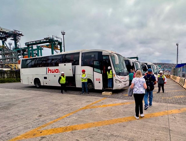 The port in San Antonio is a commercial port rather than a cruise port. It has berths to unload multiple ships at a time and many giant cranes. There is a small terminal building which is where busses or shuttles take cruise ship passengers. On boarding day we saw a lot of busses going to and from the port all morning. They were dropping off new passengers coming straight from Santiago for the cruise and picking up disembarking passengers from the previous cruise to go back to Santiago for their flights home.