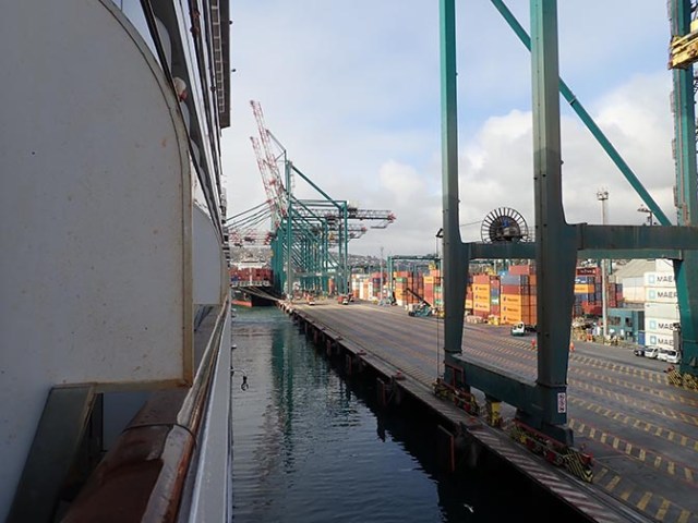 There was a whole flock of other boats too so some were probably pleasure boats. Between that and open water there’s a commercial port with different areas for loading or unloading container ships, car carrier ships, and the sort that carries grain. Some of the berths have enormous cranes for unloading the containers. The one for grain ships had a piping system that extends from shore to the ship. We saw our ship come in from the hotel window, though where it docked in the container port was behind another ship and some containers so not much of it was visible from the window after it docked.