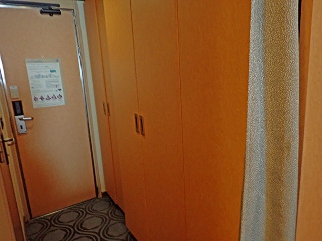 Besides the bed, which can be set up as 1 queen or 2 twins, the room has a couch a table, and a small refrigerator. Upon arrival the refrigerator is set up as a mini bar. If you don’t want to buy those things you can ask the steward to remove them. Which is always a good idea since they want a fortune for each tiny thing. Better to have empty space in the refrigerator so you can put things you want there.