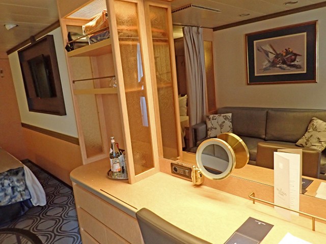 The vista suite has lots of storage space. It has 4 closets, two with hanging bars at the top and 2 with shelves. One of those also has a low hanging bar and one of the ones with a top bar also has some optional fold-down shelves. There were enough hangers already in our cabin that we didn’t need to ask for more, which is quite rare on a cruise ship. One of the closets had bathrobes on a shelf, something we often have to ask for. The desk area has 3 sets of 3 drawers and the nightstands have 2 drawers each.
