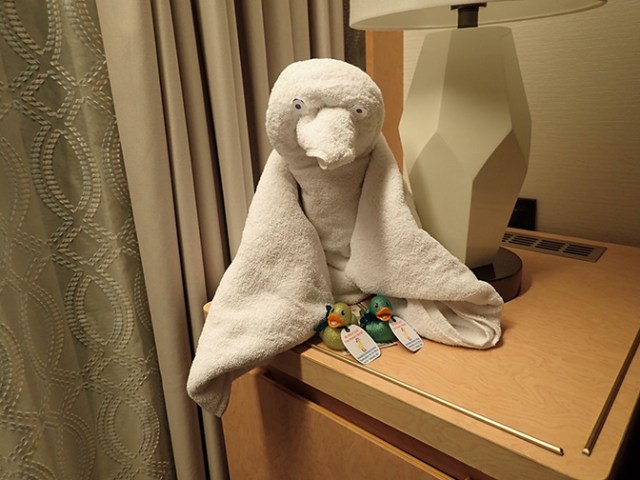 If you happen to stay in Vista Suite 6147 on the Zaandam I hid a little stealth black duck behind the TV that blends in well enough that it isn’t likely to get found by anyone who doesn’t know to look for it there unless someone repairs or replaces the TV or is a really thorough duck searcher. I haven’t found a duck in any of the cabins we’ve stayed in yet, but usually leave a couple for future guests somewhere the steward isn’t likely to look. I also leave one for the steward, but that’s out in plain sight with the tip. We left two for the stewards on this ship since they worked in pairs. Also a towel owl, which is one I commonly leave for stewards because it’s my own creation so not one that they make, or at least not that I’ve seen so far. It’s a pretty easy one though so once they’ve seen it they might start making them. Possibly some already have.
