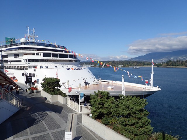 The big drawers under the ends of the beds only had a tiny bit of stuff in them rather than being full of spare bedding as they sometimes are – at least at the beginning of the cruise. Later the steward had more stuff in one of them. A lot of the ships we’ve been on recently have had those big drawers at the ends of the beds, but the stewards nearly always have stuff in them so they rarely ever count for passenger storage space. There’s still room under the bed for luggage storage even with that drawer taking up a lot of the underbed space. There’s also a couple shelves above the desk. Suites on the Zaandam also come equipped with a set of binoculars, which can come in handy for wildlife spotting on an Alaskan cruise.