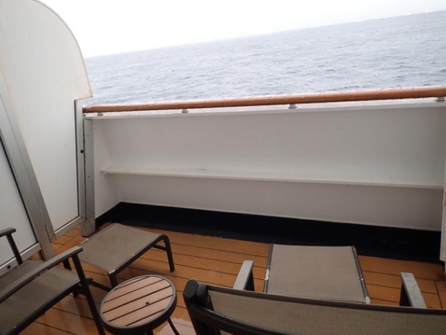 Furniture inside the cabin is high enough to see over the wall when sitting on it, and there is nothing blocking the view if you stand on the balcony. The only things you can’t see is whatever you would see through the plexiglass that regular balcony cabins have instead of the metal wall. Anything seen above the plexiglass is the same. You can even see the view over the wall when sitting on the deck chairs out on the balcony. Just not the water up close that is usually seen through the plexiglass. Besides the lower price for being obstructed, the benefit of this sort of balcony is that it is nearly double the size of a standard balcony so you have lots of space to stretch out in the deck chairs – which are accompanied by a foot stool for doing so. There’s also a small table on the deck. Standard balconies don’t always have enough space to stretch your feet out before they come in contact with that plexiglass wall.