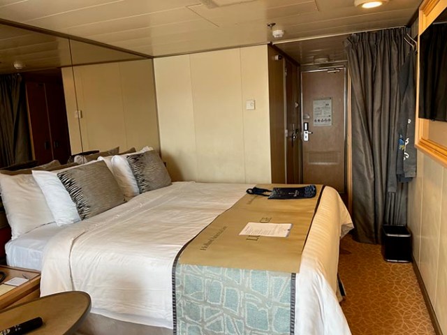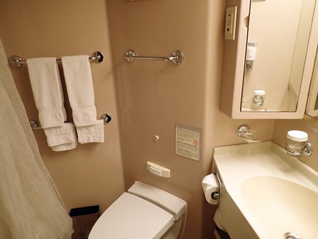 When you first enter the room there is a bathroom on one side and closets on the other. The bathroom has a tub/shower combo so it is slightly larger than bathrooms where there is just a shower. Bathtubs are standard in most cabins except interior and accessible on Holland America. On many cruise lines only suites have tubs. There’s a cabinet above the sink with three shelves inside and a mirror on the door. The space above the sink is also a mirror. A rack above the toilet holds the towels. There’s a shelf running along the wall underneath of the sink that is the biggest storage space in the bathroom. Also some room on the counter to put a few things.