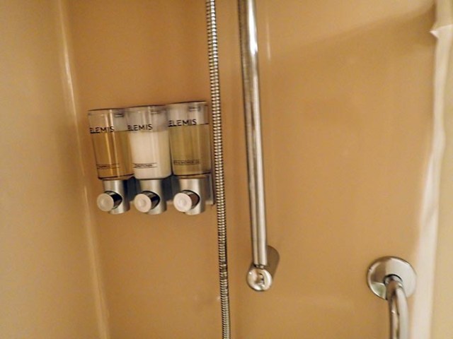 It has 2 glasses in holders on the wall as well as two other wall mounted holders that might have been intended to hold soap, but since there is liquid soap in a container mounted on the wall that isn’t necessary so they can be used for other small items. A bottle of hand lotion is mounted on the wall next to the hand soap. The shower has separate shampoo, conditioner, and body wash mounted high enough to be convenient for taking a shower, but too high for taking a bath as you have to stand up to reach them. Nice to have all 3 and not the nasty all-in-one garbage that some ships have. Speaking of garbage, there is a small garbage can in the bathroom and one that has separate sections for garbage and recyclable paper in the main cabin area.