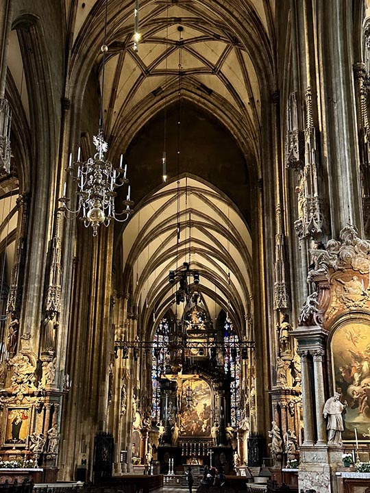 The guided part of the tour ended in a shopping area near a very tall and ornate church, which people were allowed to go inside for free. That was to be the meeting place an hour and a half later for anyone wishing to take the bus back to the ship, which we did not do. Inside the church it had huge stained-glass windows and very ornate details. Looking up and to the back of the church there was an enormous pipe organ sprawling across that entire end of the church on a balcony above the entrance.