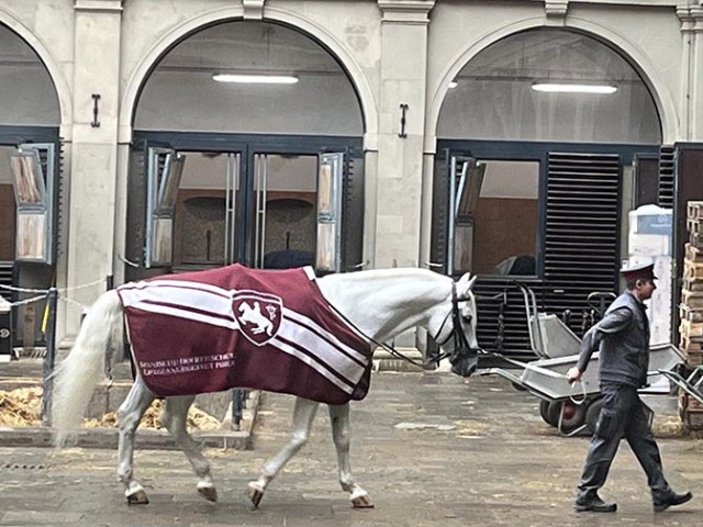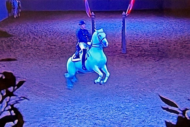 There was a pay-extra excursion offered on the ship to see the stallions perform, but we did not do any pay-extra excursions, just the ones included with the cruise. We did walk past the facility where we could see some horses in their stalls, and one got walked across a courtyard. There were a couple TV monitors by the walkway that showed stallions performing.