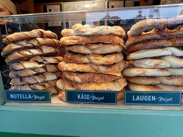 The amusement park is not too far from the port. The weather was cold and winds that were predicted to be quite heavy that afternoon started picking up while we were at the top of the wheel so we didn’t spend a lot of time looking around the booths at that park’s Christmas market before heading back to the ship, though we did stop there long enough to have a hot drink and share a giant soft pretzel. European wheat is different from the wheat in America and not nearly as likely to bother non-celiac people with gluten sensitivities to American wheat.