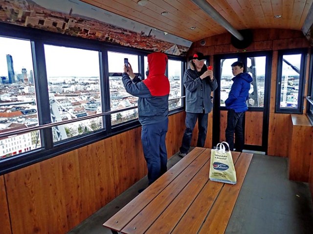 The first pod that stopped in front of us while we waited to get on had tables and chairs in it. Some people got out, then an attendant went in and cleaned off all the tables while the ride sat there. Then it moved on and an ordinary one with a bench in the middle came down, which we were allowed into. It has windows on all 4 sides, of which the middle ones on the longer sides will open for people to take unobstructed photos. The bench is wide enough to for people to sit back to back on both sides. Nobody sat for long though as everyone stood near windows. There were only 5 people in the overly large car so we could move around from one window to another to get photos from different places.