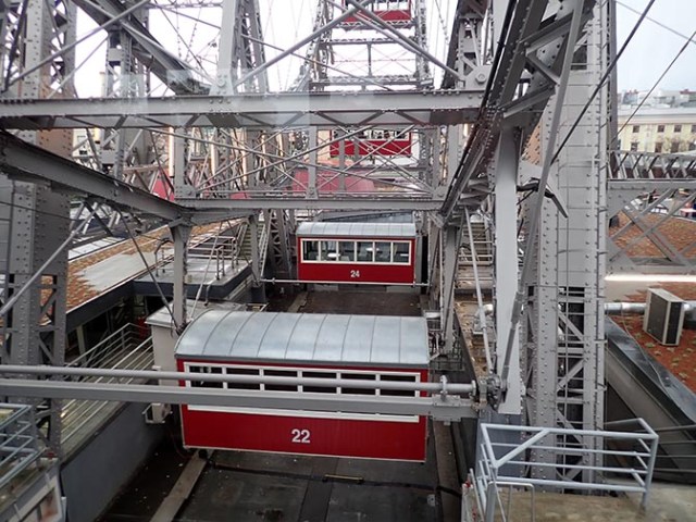 The oldest Ferris wheel still in operation is in Vienna at Wurstelprater amusement park about a mile and a half from city hall. The cabins that you ride in actually look like little cabins and each one holds 6 or 8 people comfortably, though more could squeeze in.