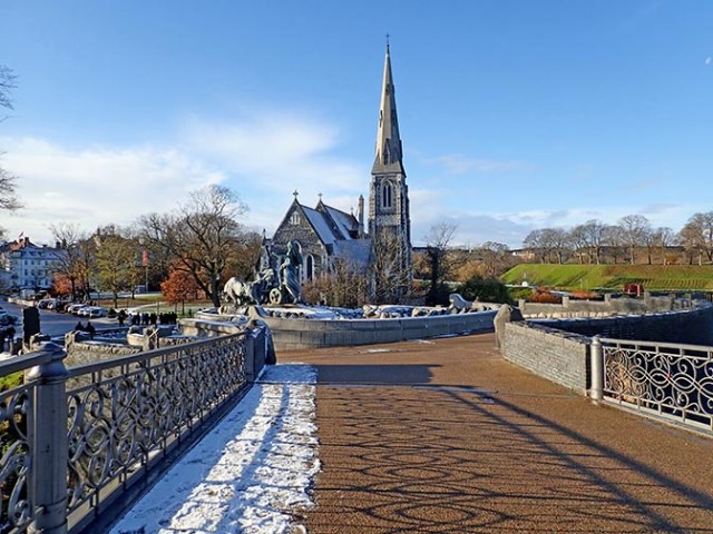 After not getting on the bus we walked along the waterfront a bit and came across Copenhagen’s famous little mermaid statue. She more has what looks like legs with some fins at the foot end than a full mermaid tail as they are usually depicted. The statue has been there since 1913. It has been vandalized and restored a few times. Shortly after the mermaid statue we walked by Saint Alban’s church.