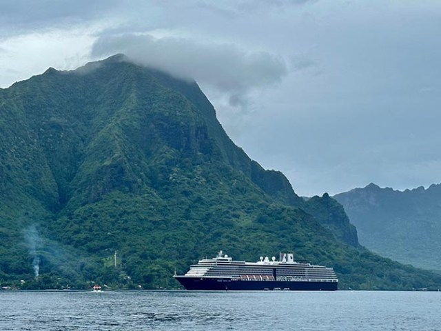 Bahia d’ Opunoha or Opunohu Bay is where cruise ships often anchor when visiting Moorea in the Society Islands of French Polynesia. Passengers tender to a pier near the small remote town of Papetoai. There isn’t much near the pier so a tour or taxi is required to leave the area. Some ships may still Anchor near Cooks Bay and tender to a dock there. That used to be the main port, but now most ships go to Opunohu Bay, which is where Holland America Noordam went on our cruise across the Pacific Ocean. There is not much public transportation on the island.