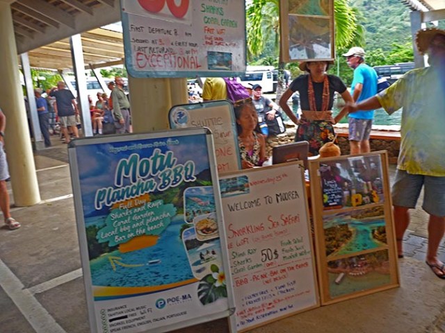 The island is the remains of half a volcano with 8 peaks and two symmetrical translucent bays, Cook’s (Paopao) and Opunohu. The name means yellow lizard in Tahitian. From overhead the island appears roughly as the shape of a heart and is one of the top honeymoon destinations near Tahiti. Popular activities in the lagoons include snorkeling, diving, feeding rays, and jet skiing. Whale watching tours and swimming with dolphins in a natural reserve at the island’s dolphin center are popular activities. Other activities include helmet diving, sky diving, hiking, or a visit to Tikiparq zipline and obstacle course or the island’s Tiki Village for a traditional feast and Polynesian dance show. Many of those activities were not offered through the ship or at the port so people would have to book them through outside sources and make sure they had transportation to get there and back. When booking through outside sources it’s necessary to insure you have enough time to meet your transport, get to the destination, do the activity, and return to the ship within the time the ship is in port. Outside bookings often want people to take the first tender to shore, but that first tender doesn’t have room for everyone and people on ship’s excursions may have priority on the tender over those who don’t.