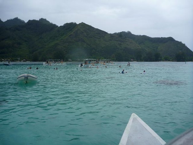 On the boat they offered juice or water between the two stops and pieces of fresh pineapple after the second one. The second stop was near a beach where other people from the ship had a land-based excursion on that motu. A motu is a small islet on a coral reef. There was a picnic area and small restroom onshore where the other people were. They were at the edge of the water on the beach with a big ray when we first arrived, but went back into the woods shortly after.