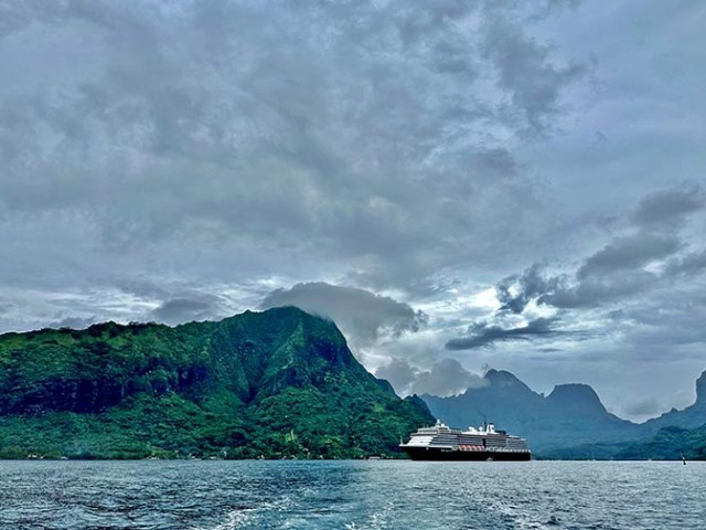 As we disembarked the tender in Moorea, a guy with a sign for our excursion number (13) stood in an empty boat with rows of seats under a canvas top just across the dock. The top of the island was shrouded with fog and later it rained a bit, but you’re going to get wet snorkeling anyway. Weather like that is great for preventing sunburn, but a bit chilly for wet people sitting in an open boat. Other than the somewhat leaky canvas top the boat was open all the way around.