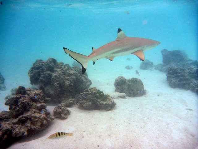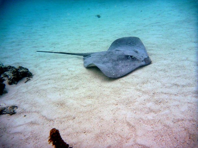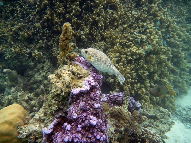 After snorkeling awhile in that spot everyone got back on the boat and it moved into a more sheltered cove without the current. Swimming away from the boat was much easier there, taking very little effort at all. There weren’t as many rays or sharks at that location, but plenty of fish once you swim a bit away from the boat. It pulled up nearly to shore there in some pretty rocky sand without much to see, but farther away from the boat there were a lot of patches of coral and I even saw some puffer fish.
