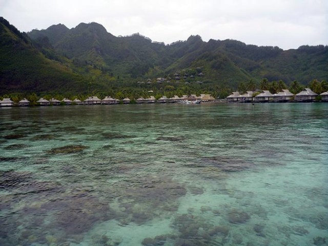 They took us for a bit of sight-seeing on the way to the first stop, first going at a good vantage point for ship photos and then past a closed resort on the shore with another resort on a hillside above it that is still in operation. Much of the water is very shallow throughout that lagoon with coral just under the surface so there are marked paths that the small boats follow to keep from running aground.