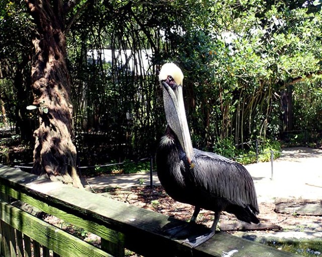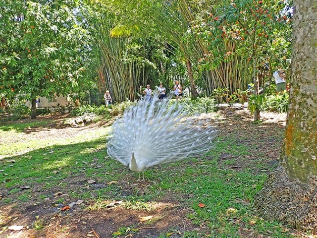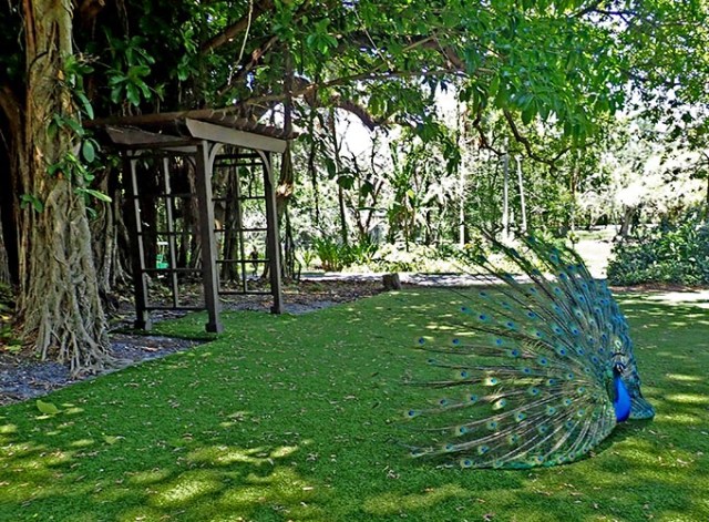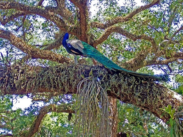 The former owner’s house is a little museum of their time period in around the 1920’s or 30’s. It’s called the Historic Wray Home. A building near there is called the Barbecue Pavilion. The name is deceptive because unless renting it for an event it’s not actually a restaurant. There is a food truck and snack shack near the tram station, which was the only food available in the park. Bin chickens (ibis) hang out at the picnic tables by the food waiting for people to drop stuff. We also saw one peahen and another little black bird hoping for handouts there. We got our lunch at the food truck along with a smoothie from the nearby smoothie bar. I got the food and Linda got the drinks. I expected her to have those in hand and come find me while I waited for our food to cook, but it took just as long waiting for the smoothies to get made as it did for the food so we met in the middle each looking for the other having gotten both things at the same time. There were not any empty picnic tables in the food area so we had to share one with a couple people already sitting there, and then others after they left and new ones came looking for a place to sit.