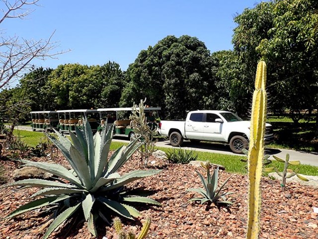 A tram ride which had tram cars pulled by a pickup ran every half hour and took about 20 minutes for a narrated ride around various gardens with a brief stop next to the cactus garden by the butterfly conservatory. It stops long enough for people to take a quick walk through the butterfly house. People can also walk those paths out to see the things on the tram tour.