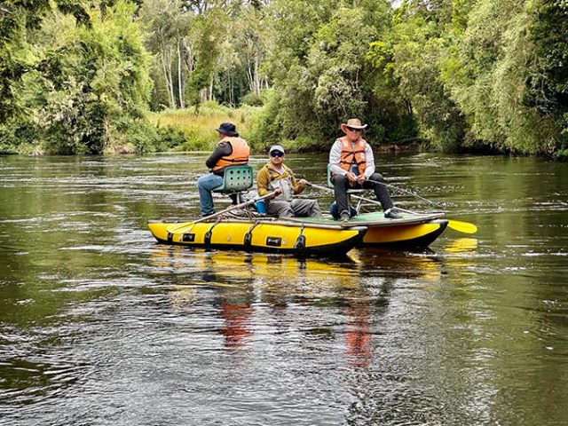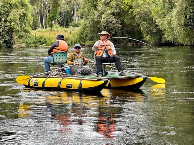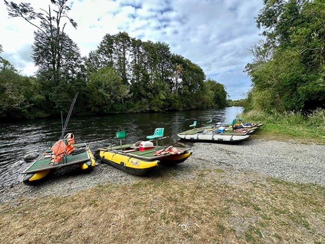 One at a time, spaced a couple minutes apart, the rafts departed into the slow-moving water. Along the banks native fuchsia plants in full bloom provided a colorful backdrop and reflections nearshore. Some areas also had native bamboo plants that stretched high into the sky. My first cast with the fly landed exactly where the guide pointed. Our guide told us brown trout weighing up to five pounds and smaller rainbow trout would be our target species. Small streamer flies cast and then quickly “stripped” while holding the rod tip just above the water would hopefully attract a bite.