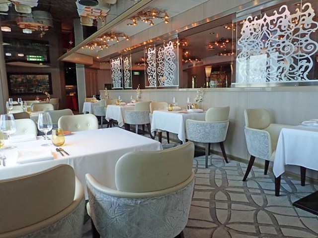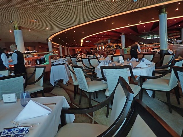 Holland America’s upscale restaurant, the Pinnacle Grill is often popular on short cruises, but on a cruise where people are booked for 34-48 days or longer it’s pretty hard to keep a pay-extra eatery full every day. Dinner saw a few more people, but even then walking past  often meant seeing numerous unoccupied tables, though more people than at lunch time. When we originally asked about reservations at first they said they weren’t sure if they could get us in because the computer system was down, but once we said it was for lunch rather than dinner they said no problem. They weren’t kidding since on the two days we had lunch there only 2-3 other tables had guests.